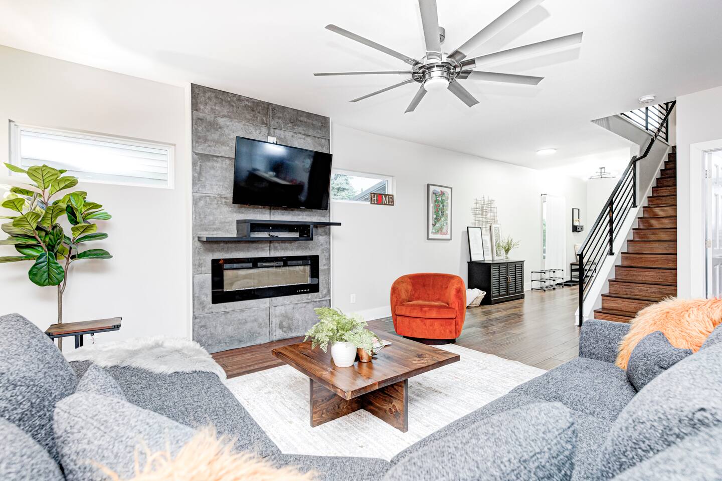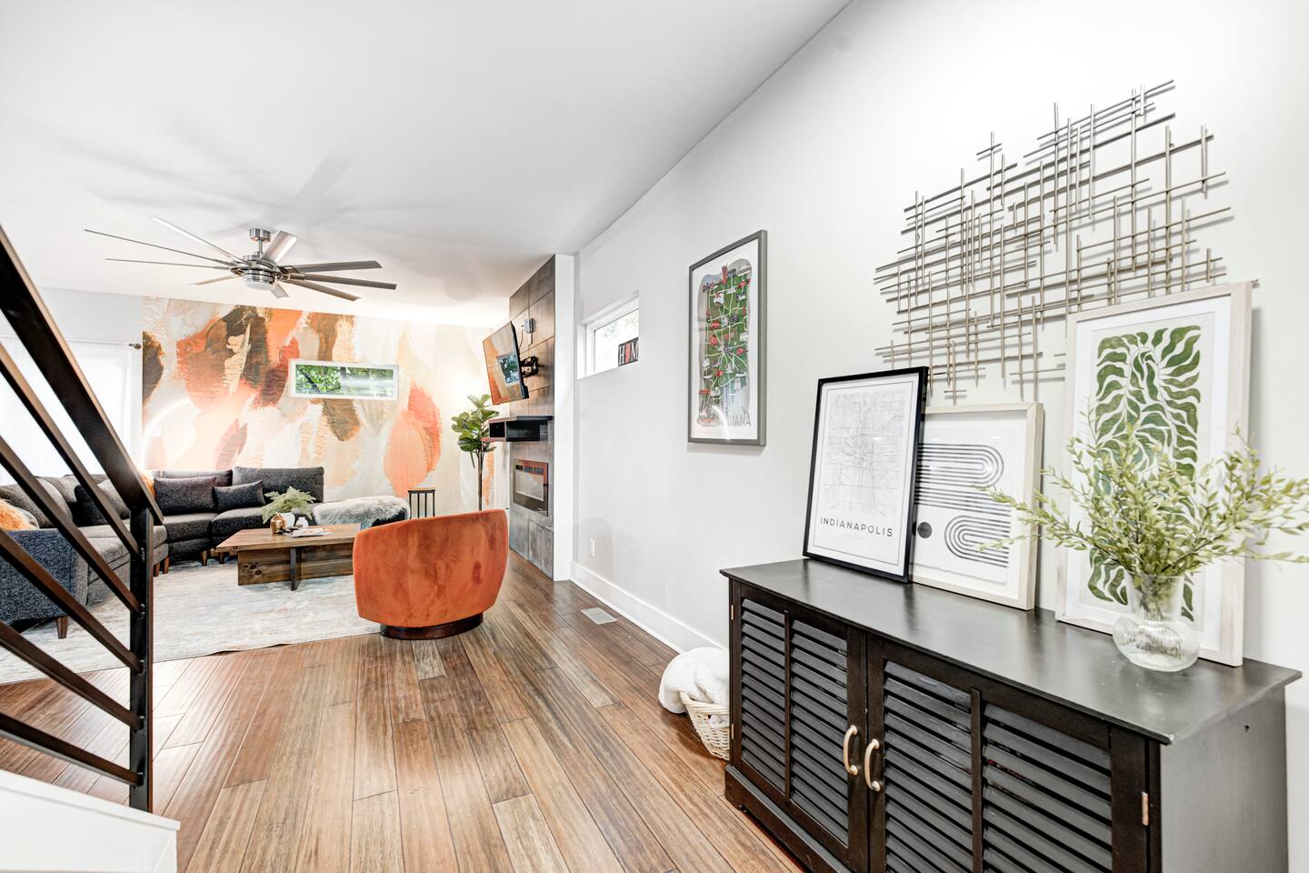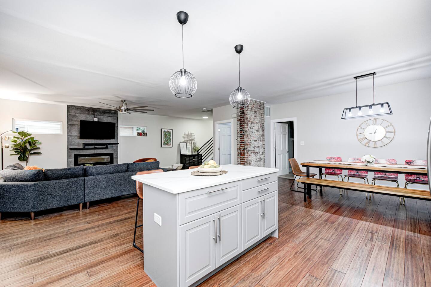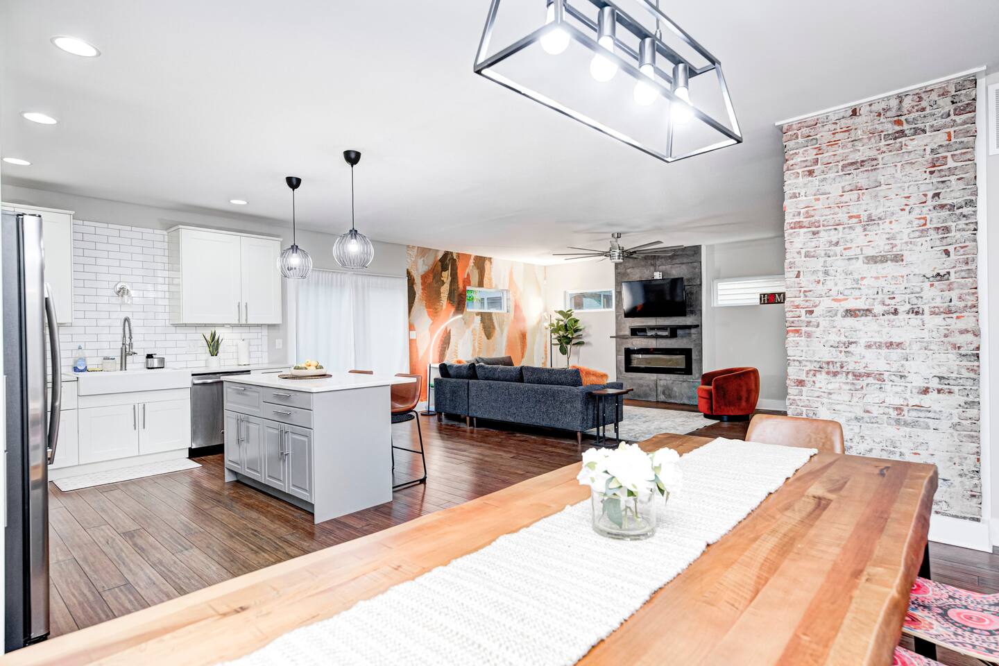 ✨ Stylish & Comfortable Living Step into an open-concept space filled with natural light, gleaming hardwood floors, exposed brick, and thoughtful finishes throughout. Unwind in the cozy living room with a modern electric fireplace or enjoy movie nights in the finished basement media room with surround sound. ✔ Comfortable Bedrooms for the Whole Family ✔ Fast Wi-Fi for Work or Streaming ✔ Laundry Closet w/ Full-Size Washer + Dryer ✔ Jack-and-Jill Bathroom shared with the two upstairs bedrooms ✔ Two spacious bedrooms each feature two full-sized beds, comfortably sleeping 4 guests per room—ideal for families or friends ✔ Two Suites — One with Balcony + Spa-Inspired Bath 🍳 Chef’s Kitchen Highlights: ✔ White shaker cabinets & farmhouse sink ✔ Quartz countertops & stainless steel appliances ✔ Massive center island for prepping, gathering, and dining 🌿 Outdoor Spaces You’ll Love: ✔ Covered front porch for morning coffee ✔ Private back deck — perfect for evening drinks or a quiet moment outdoors 📍 Prime Fountain Square Location — Walk or Drive to It All! ✹ Fountain Square Cultural District – 3-minute walk to local shops, art, and vintage arcades ✹ Bluebeard, Milktooth & La Margarita – Some of Indy’s best eats, all nearby ✹ Lucas Oil Stadium – 7-minute drive to catch the Colts or major events ✹ Gainbridge Fieldhouse – 8 mins to Pacers games & concerts ✹ Mass Ave & Bottleworks District – Under 10 mins for local art, nightlife & shopping ✹ Garfield Park & Sunken Gardens – Just 5 mins for a dose of outdoor space Whether you're exploring the cultural trail, catching a show, or just enjoying the quiet neighborhood vibes, this home is your ideal spot for a comfortable stay in a vibrant city. ☆☆ Book your unforgettable experience today — Indy is waiting! ✹