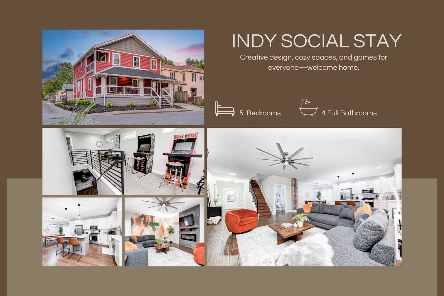 🌟 Experience Indy in Style! 🌟 Just steps from lively Fountain Square, this beautifully renovated 5-bedroom, 4.5-bathroom home blends historic charm with modern design. With stylish finishes, spacious living areas, and cozy gathering spots, it's perfect for families, friends, or business retreats. Enjoy a fully stocked kitchen, fast Wi-Fi, smart TVs, and outdoor seating. Walk to Indy's best dining, live music, nightlife, and local attractions. Your perfect stay starts here, book now!